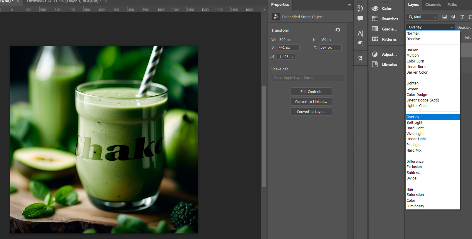 글씨가 컵 위에 프린팅 된 것 같은 느낌을 주기 위해 글씨 레이어를 Overlay로 바꾸어 반 투명한 느낌으로 해주었습니다.