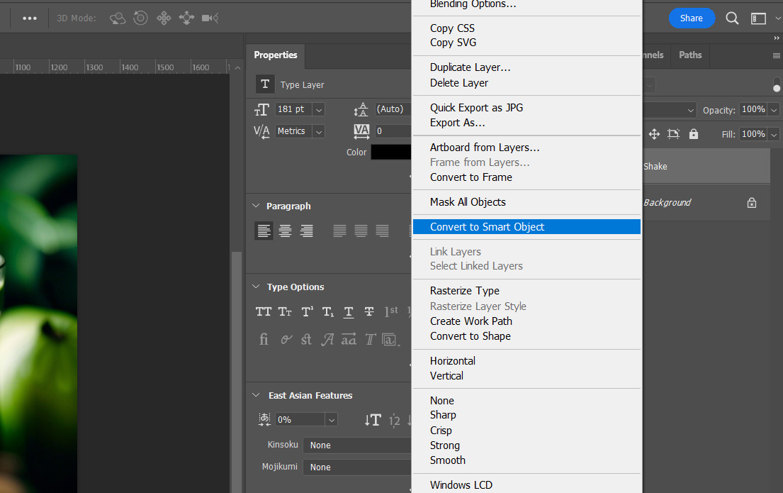 글씨의 레이어를 클릭하여 Convert to Smart Object를 눌러 줍니다.